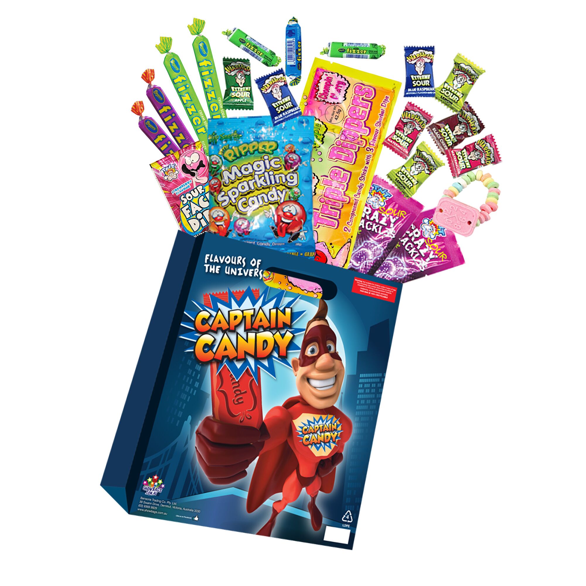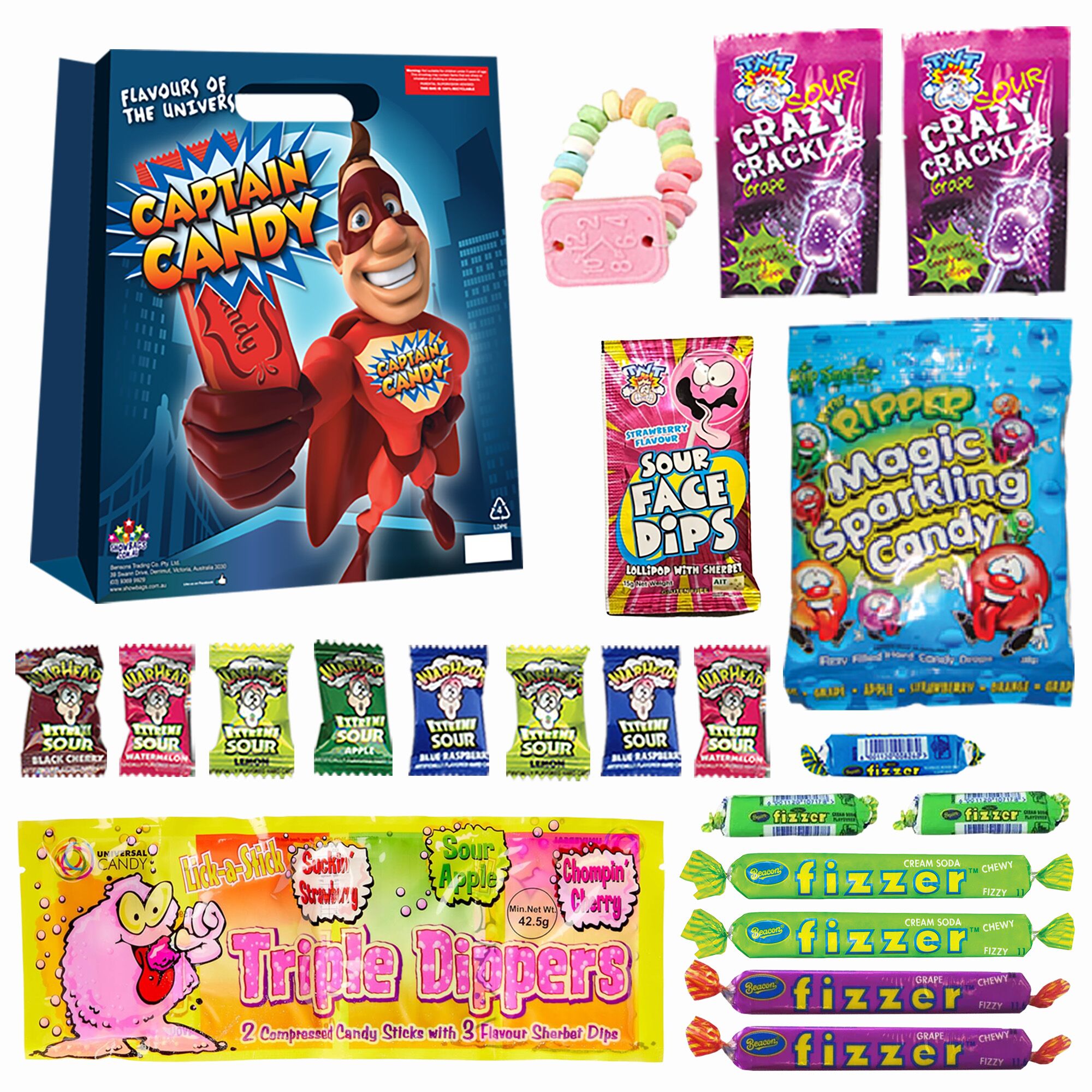 Sparkling and popping delights, the Captain Candy showbag contains: 1 x Candy Watch, 8 x Warheads Candy, 1 x 42.5g Triple Dippers, 1 x 15g Tnt Sour Face Dip, 1 x 30g Little Ripper Magic Sparkling Candy, 2 x TNT Mega Sour Crazy Crackles,2 x 11.6g Fizzer Cream Soda, 2 x 11.6g Fizzer Grape, 2 x 7.4g Fizzer Mini Cream Soda and 1 x 7.4g Fizzer Mini Blue Buzz.. Unleash the magic of these tantalizing treats and embark on a flavor-packed journey with Captain Candy!