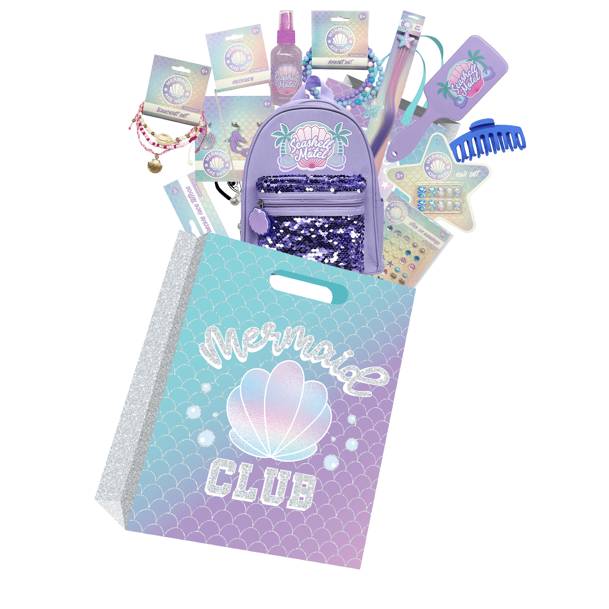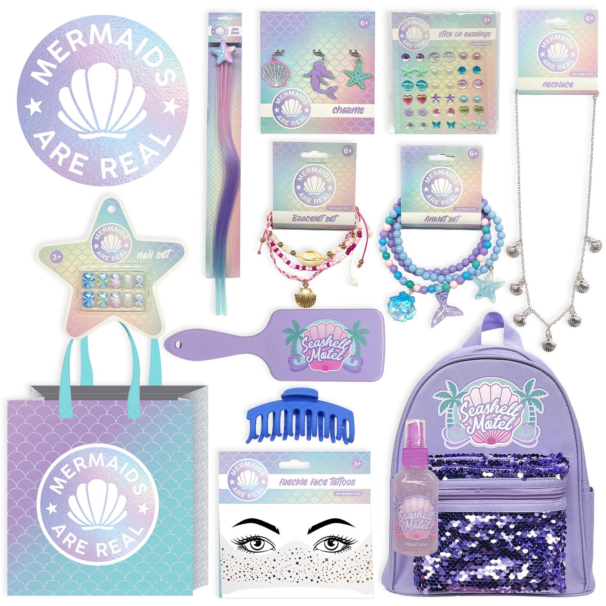 Dive into a world of glitter and enchantment with the Mermaids Showbag — a magical bundle filled with shimmering accessories and ocean-inspired goodies! Perfect for fans of all things mystical and mermaid, this showbag includes a gorgeous mermaid backpack, anklet, bracelet set, necklace, and a selection of cute mermaid charms. Add a sparkle to your style with the mermaid body glitter spray and decorate your look with the freckle tattoo, stick-on earrings, and nail set.