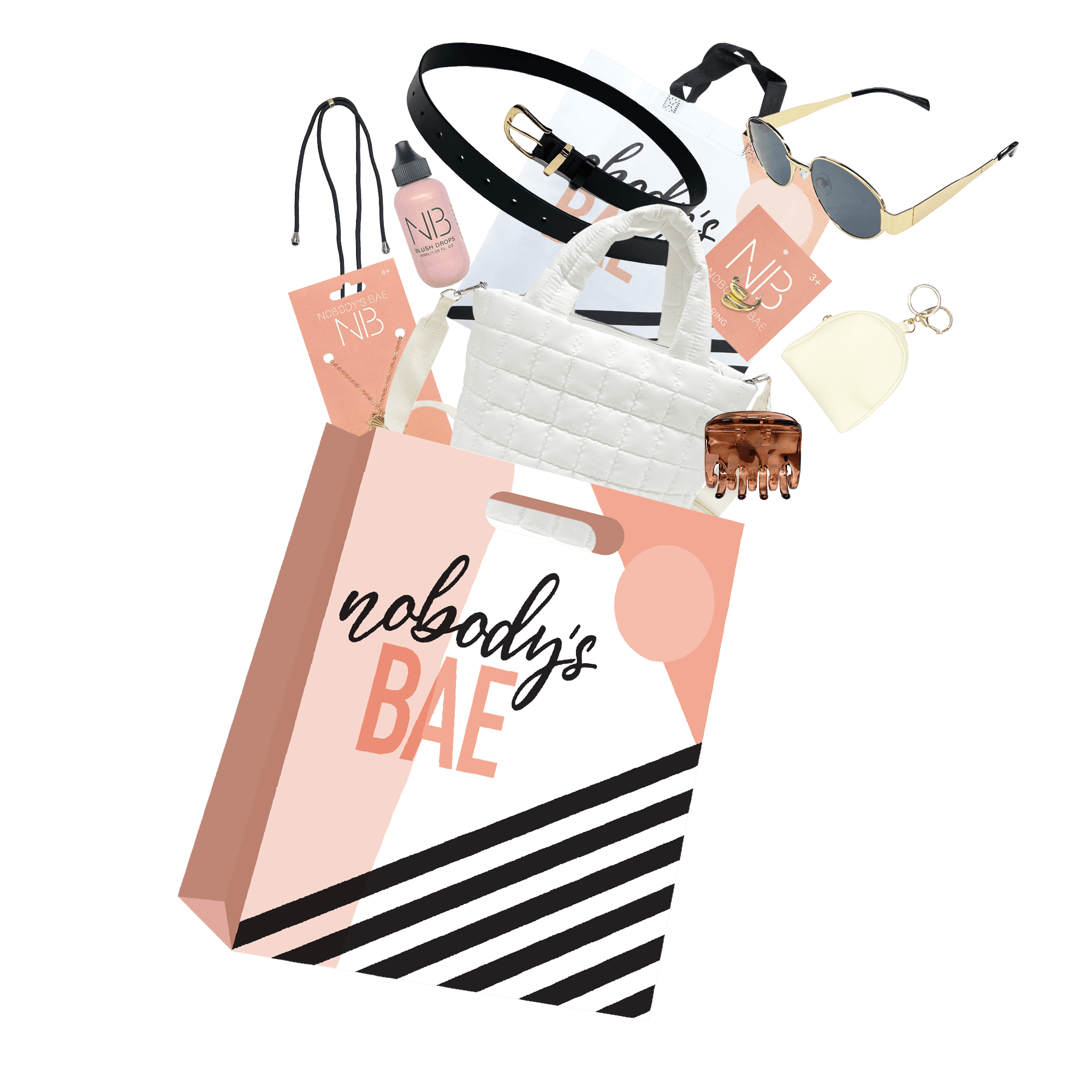 Own your glow and show the world you’re Nobody’s Bae. This showbag is packed with fierce, fashion-forward essentials including a cute handbag, sunglasses, belt, and hair clip to elevate your look. Add glam with the necklace, ring, and dewy blush drops, plus stay hands-free with the phone lanyard and bag keyring. It’s all about self-love, confidence, and bold style – delivered in a chic non-woven bag. Because you don’t need a bae to slay.