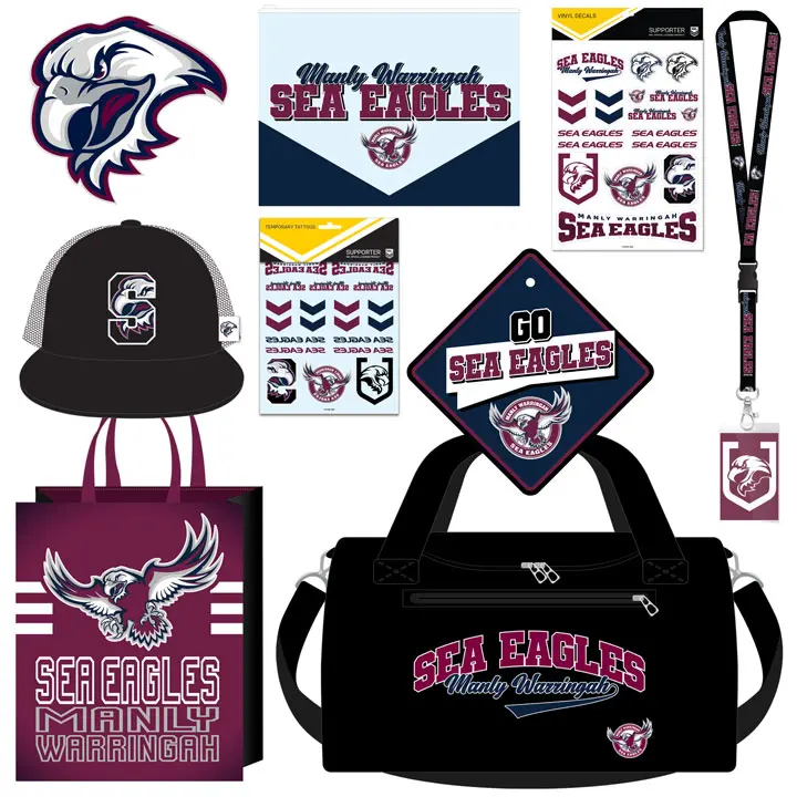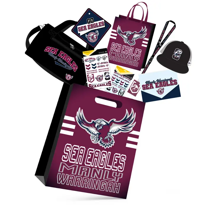Introducing the ultimate Manly Sea Eagles Showbag! This showbag is the perfect way to show your support for the NRL team and contains all the gear you need to show your pride, including a pencil case, vinyl decals, a lanyard with team card, a car sign, temporary tattoos, a cap, and a sports duffle bag all packed inside a licensed official Manly Sea Eagles reusable tote bag.
