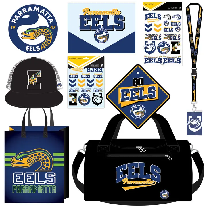 Show your support for the NRL team with all the essentials you will need! Including: a pencil case, decals, lanyard, car sign, tattoos, cap and duffle bag, all packed in a licensed official Parramatta Eels reusable tote bag, perfect way to take your team on the go.