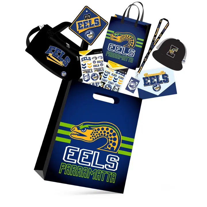 Show your support for the NRL team with all the essentials you will need! Including: a pencil case, decals, lanyard, car sign, tattoos, cap and duffle bag, all packed in a licensed official Parramatta Eels reusable tote bag, perfect way to take your team on the go.