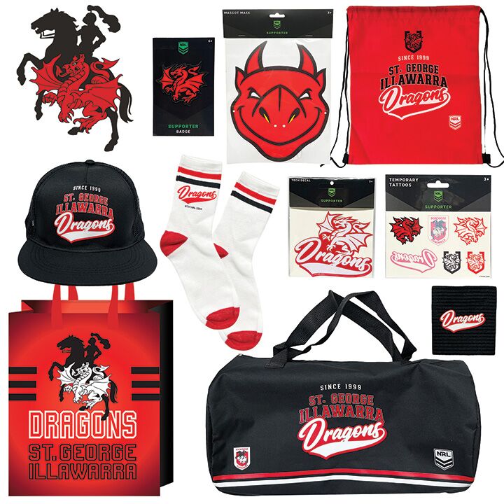 Breathe fire into your fan gear with the official NRL St George Illawarra Dragons Showbag
