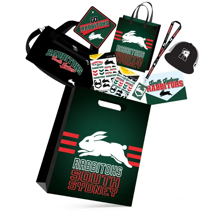 Show your Rabbitohs pride with this must-have showbag, packed with a pencil case, decals, lanyard, car sign, temporary tattoos, cap, duffle bag, all in an official reusable tote bag. Perfect for showing your support for the NRL team whether you’re heading to a game or just around town.