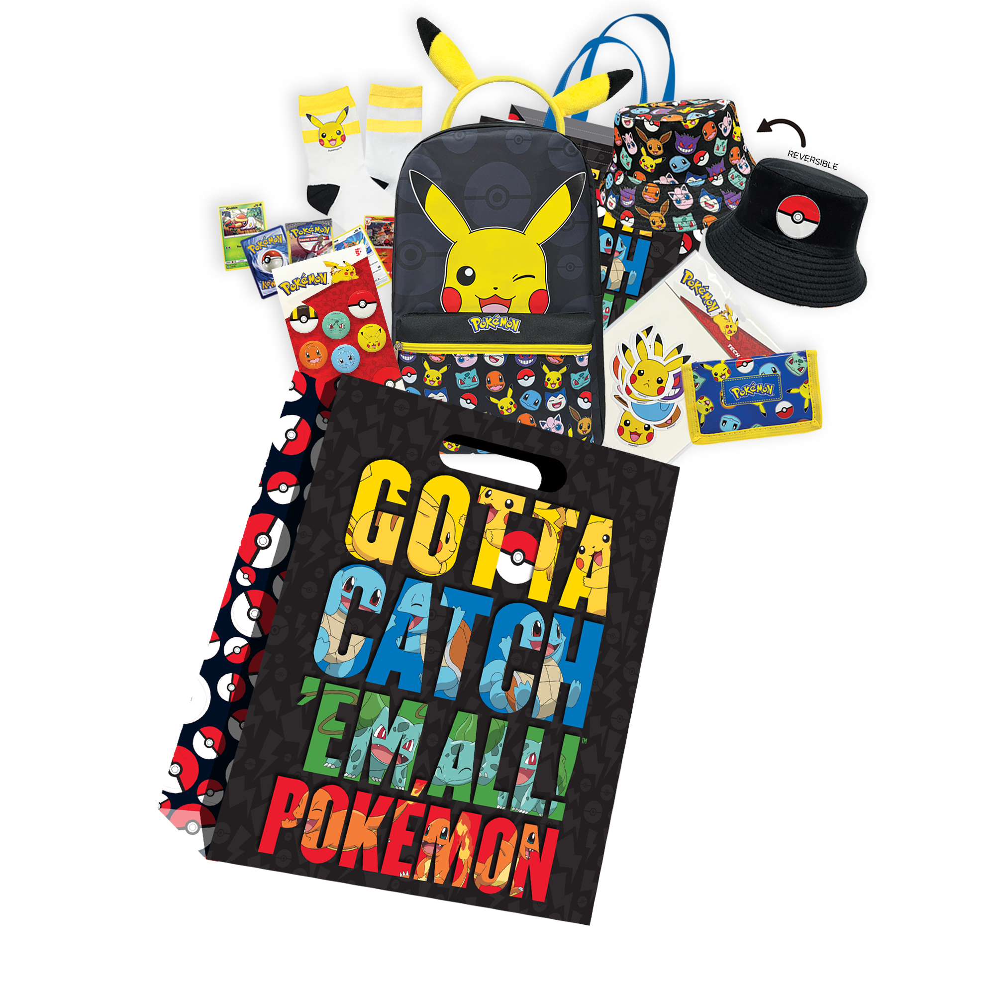 Packed with epic gear for every young Trainer, it includes a Pokémon backpack, bucket hat, and headband — perfect for adventures on the go. Decorate your gadgets with cool tech decals, show off your Pokémon badges, and step out in style with matching socks. Keep your treasures safe with a handy Pokémon wallet, and score a pack of Pokémon trading cards to grow your collection! Everything comes packed in a reusable tote bag — ready for your next Pokémon journey!