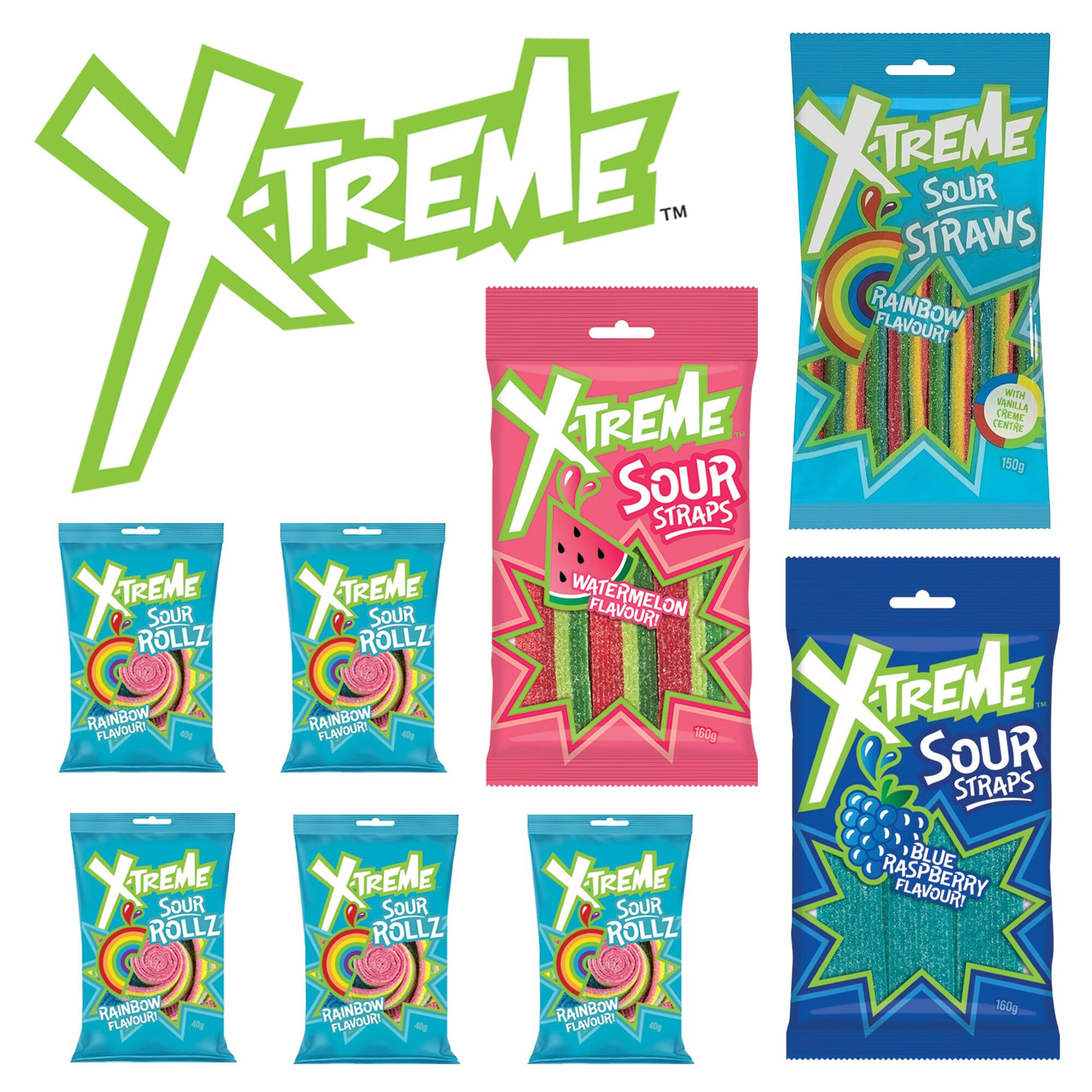 - 5 x 40g Xtreme Sour Rolls Rainbow and